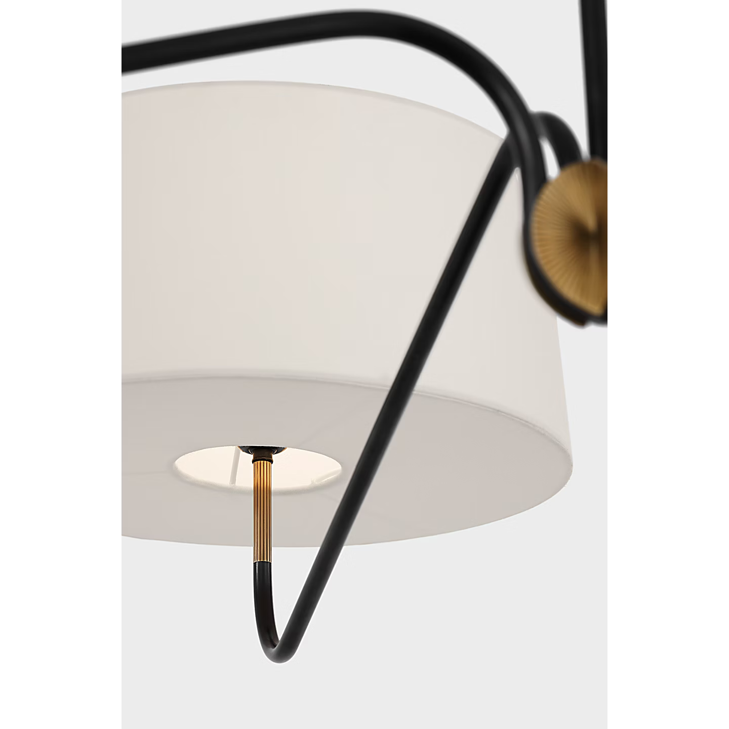 Designed by Thomas O’Brien, this piece combines black metal with brass detailing. Four curved arms extend symmetrically from a central rod. Each arm supports a white linen drum shade. The fixture mounts with a 12.4 cm round canopy.