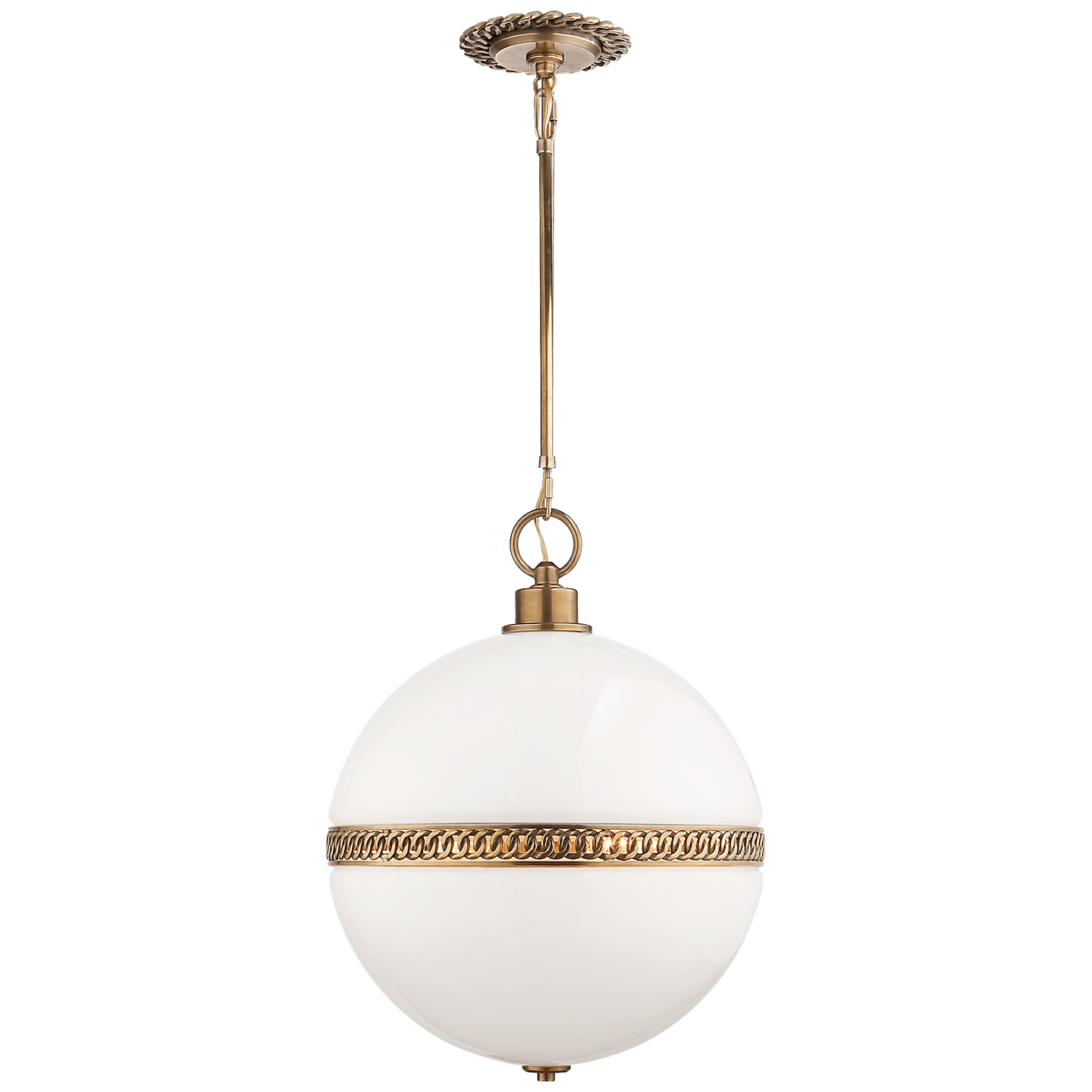 Designed by Ralph Lauren for the Signature Collection, this pendant features a white glass globe diffuser encircled by a decorative brass-finished band. The metal detailing includes a chain-like motif and a twisted rope edge on the canopy. Finish options include Natural Brass or Polished Nickel. The pendant is suspended from a straight rod, maintaining a clean vertical profile.