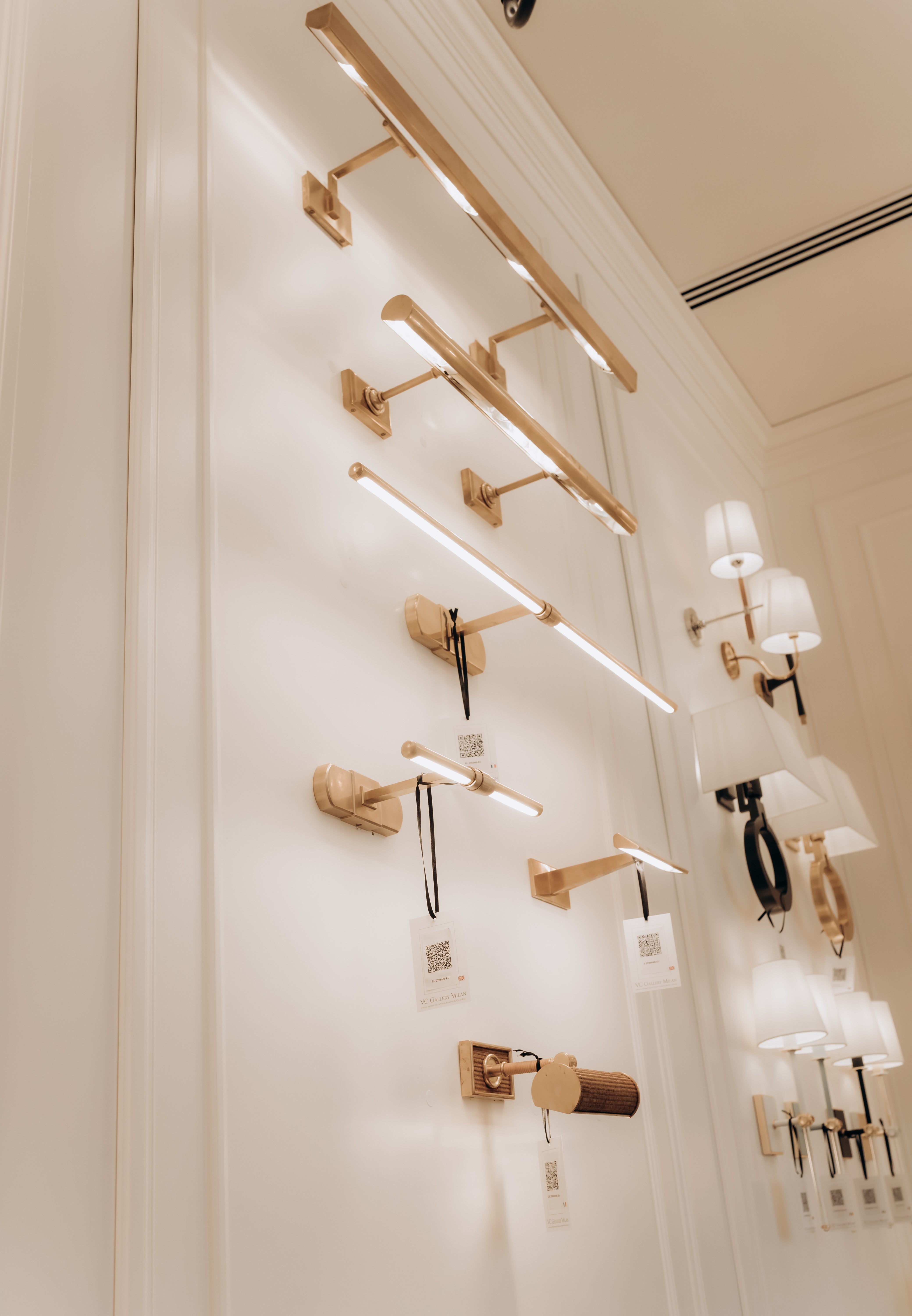 The designer picture light by Ralph Lauren features a slim cylindrical bar in a polished natural brass finish. A curved arm connects the light to a rectangular backplate measuring 7.6 cm by 21 cm. The integrated LED source delivers 1000 lumens of focused, directional light—suitable for illuminating framed artwork or photography.