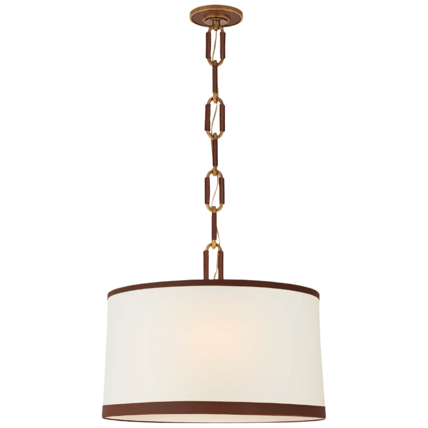Blending equestrian craftsmanship with modern refinement, the Cody Hanging Shade by Ralph Lauren brings character and warmth to any space. The slender metal frame, finished in natural brass, is wrapped in rich saddle leather, a nod to classic saddlery techniques. Suspended beneath, an oversized linen shade softens the light, providing a balanced glow perfect for living rooms, studies, or dining areas. Thoughtfully designed with attention to detail, this fixture is a statement of understated luxury, making it an ideal choice for those who appreciate both heritage design and contemporary living.