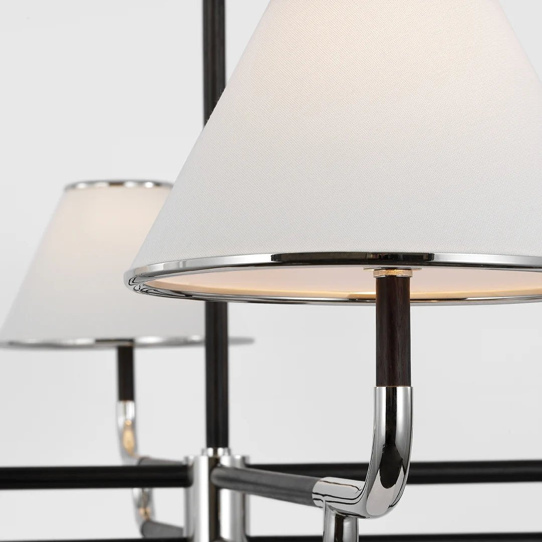 The Rigby Grande Chandelier by Marie Flanigan features a refined linear design that combines natural oak with brass or polished nickel accents. This elegant chandelier is part of the Rigby series, known for its sophisticated profiles and use of trimmed linen shades. The addition of natural oak and metal detailing gives the fixture a contemporary yet timeless feel, making it an ideal statement piece for any interior. Available in Polished Nickel and Ebony or Soft Brass and Natural Oak, this chandelier adds a unique touch to any living room, dining area, or hallway.