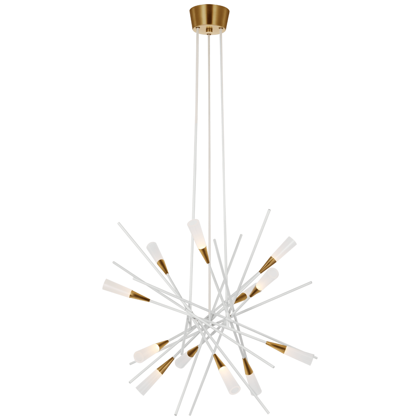 The stylish Stellar series by Chapman & Myers will become the starburst focal point of any room, entryway, or hallway. Available as single or triple-tail sconces as well as the namesake chandeliers, the designs radiate in both form and finish. Sleek or matte metal rods intersect with no central hub for an airy, modern effect and boast conical, frosted acrylic shades that make for warm and impressive illumination.
