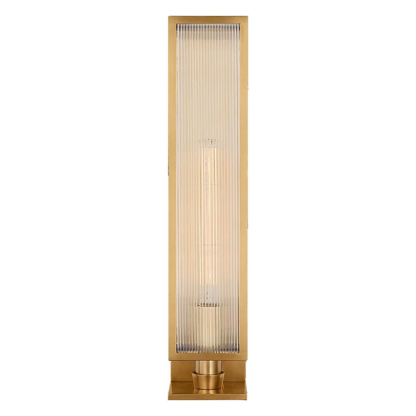 A designer wall light by Barbara Barry, the York sconce is part of the Signature Collection from Visual Comfort & Co. The fixture features a vertical brass frame in a soft brass finish. Clear ribbed glass panels enclose a single T-shaped LED bulb. Light diffuses evenly, casting a warm, ambient glow. The rectangular backplate measures 12.7 cm by 61.6 cm. Extension from the wall is 12.7 cm.